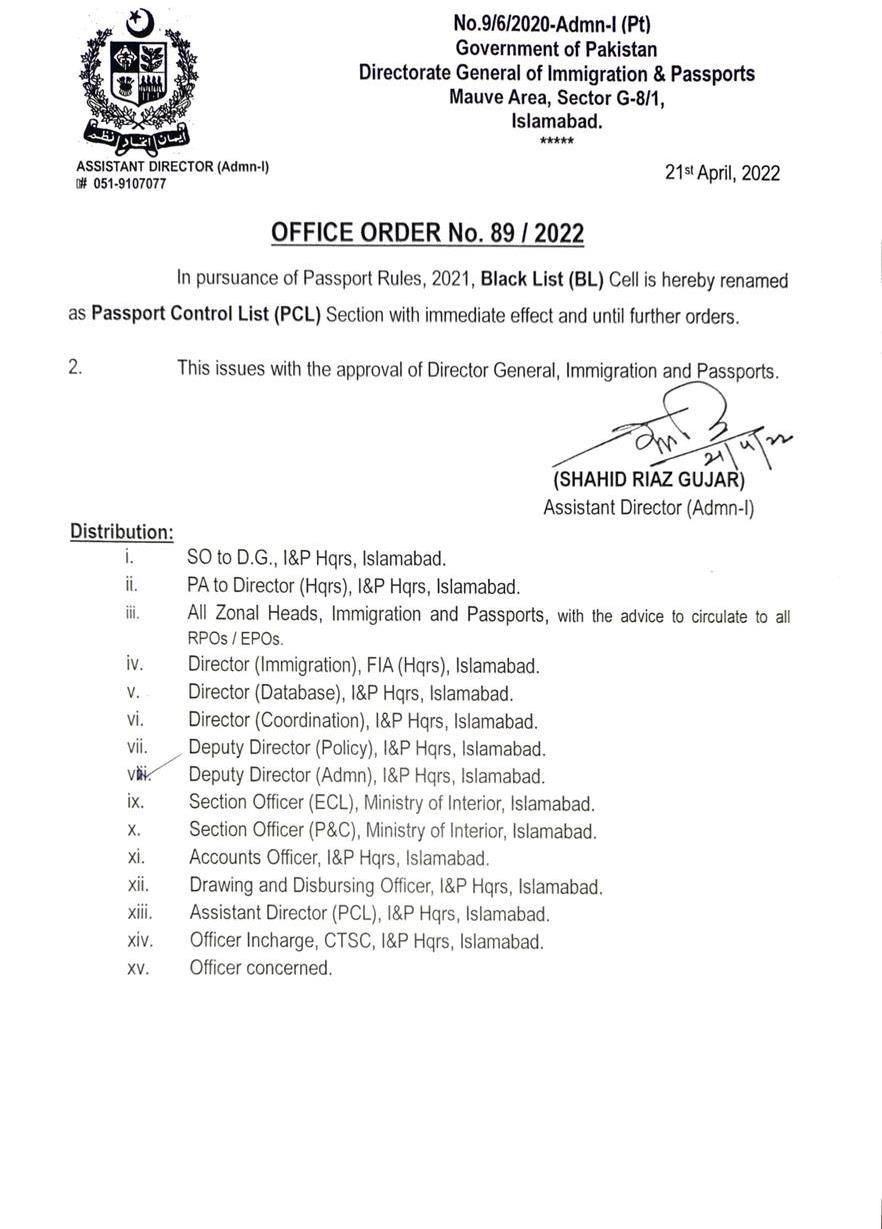 | 3 | 21 April 2022 | Rename of BL (Black List) Cell to PCL (Passport Control List) Section. | 89/2022 |