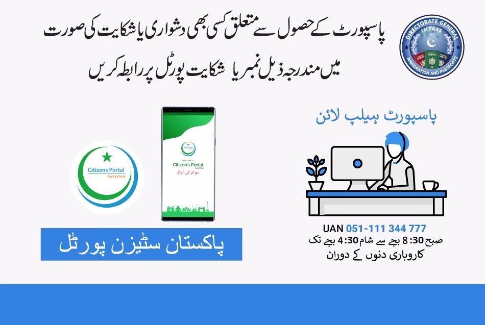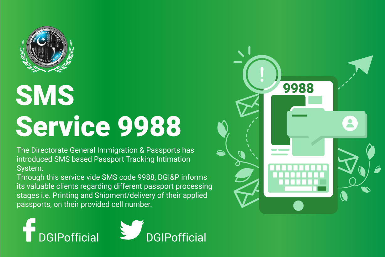 - The applicant will also be intimated about the status of their passport via SMS service 9988 inside Pakistan, while the Email Rabta service will inform about the status of the passport to overseas Pakistanis, if they have given their correct Mobile No. / Email ID at the data entry stage.